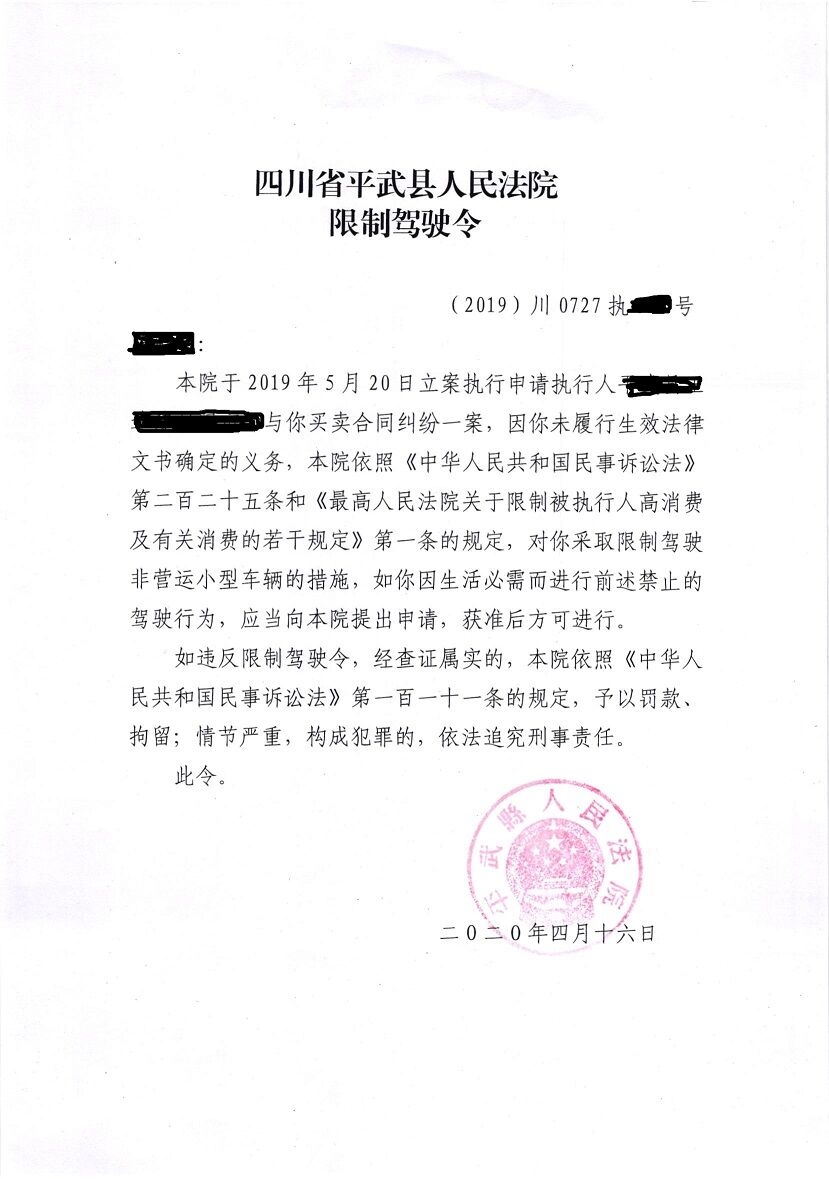 四川在线消息(记者 刘春华)近日,绵阳市平武县法院发出首批“限驾令”,四名有履行能力而拒不履行生效法律文书确定义务的被执行人,被限制驾驶非营运小型车辆。如果这四名被执行人违反限制驾驶令,经查证属实,予以罚款、拘留,情节严重,构成犯罪的,依法追究刑事责任。