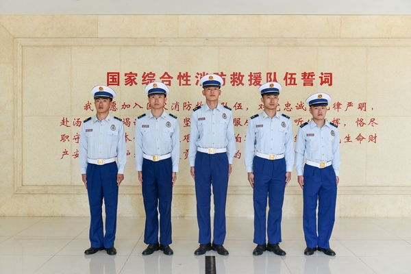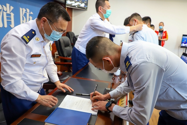 其中,邓勇、傅泷、赵之然被授予三级消防士消防救援衔;陈天宇、刁良智、袁长喜被授予四级消防士消防救援衔;杜泥克沙、杜德胜、熊林江被授予预防消防士消防救援衔;他们中年龄最大的26岁,年龄最小仅20岁;有的从学校刚毕业,有的是部队的退役士兵,有的之前还从事过专职消防员工作,经过一年的淬火历练,他们完成培训破茧成蝶,投身“火焰蓝”行列。