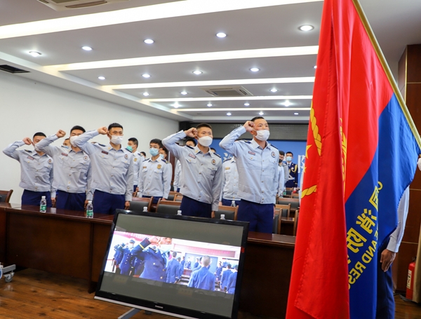 27日上午,在泸州分会场,新消防员代表签订《消防员接收协议书》;泸州市消防救援支队党委成员给新消防员佩带消防救援衔标志服饰;在中国消防救援旗的见证下,新消防员佩戴崭新的火焰蓝肩章及标志服饰,高举右手,面向“中国消防救援队”队旗进行集体庄严宣誓:“我志愿加入国家消防救援队伍,对党忠诚,纪律严明,赴汤蹈火,竭诚为民……”。