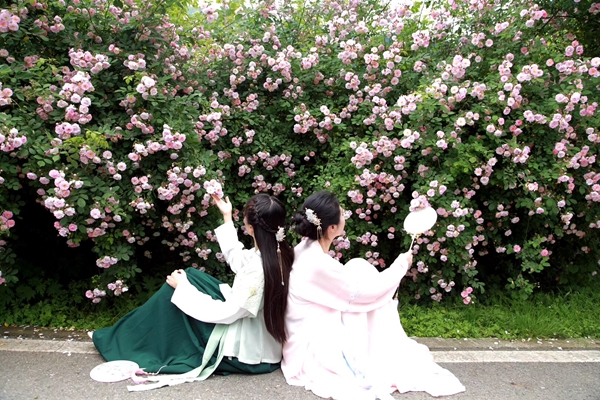 锦绣宝山,蔷薇盛放,红的如火,白的素练,粉的黄的,点绿缀彩。着汉服缓步其间,在衣袂与广袖不经意的轻抚间,是花与衣的邂逅,是今与古的惊鸿一瞥,是蔷薇与汉服在世外宝山的奇妙相遇。