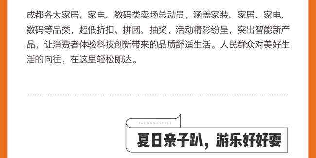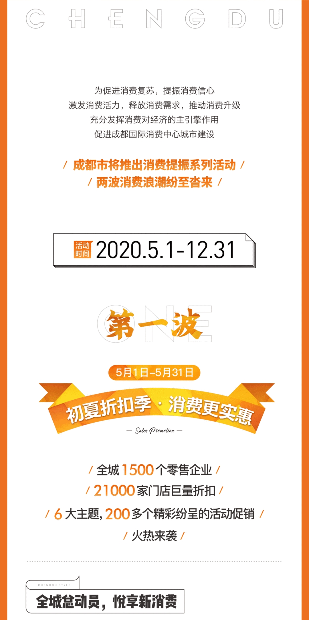 作为本次系列活动第一波消费浪潮,“初夏折扣季•消费更实惠”集结全成都21000家门店,巨量折扣来袭,“全城总动员,悦享新消费”“美丽焕新季,妆装有好礼”“食美寻香游,舌尖成都味”“精致好家居,智能潮生活”“夏日亲子趴,游乐好好耍”“线上云购物,线下趣体验”6大主题,200余个促销活动精彩纷呈,时间从5月1日至31日。