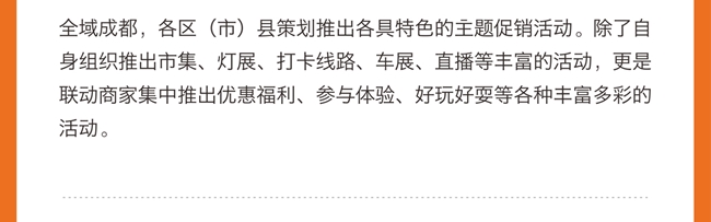 据了解,本次活动围绕消费升级新趋势,成都通过公园城市体验消费季、宜业成都安居消费季、畅游成都旅游消费季、云端逛街在线消费季等多主题分阶段性持续进行,让消费者感受到“月月有主题、精彩各不同”,引导市民扩大消费、吸引外地人来蓉消费。