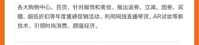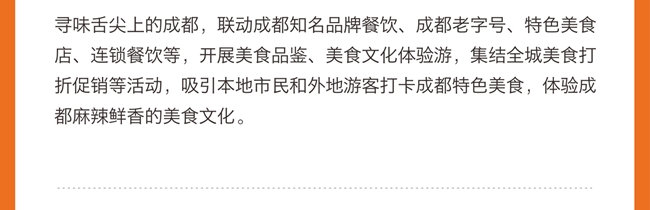 据介绍,本系列活动覆盖成都全域,主要覆盖美妆服饰、成都美食、周末亲子、文化娱乐、家装家电等消费领域。整合各大购物中心、百货的服装及美妆类产品的直播活动及优惠活动,给出超低折扣,促进消费转化;联动成都品牌餐饮、成都老字号、特色美食店等,开展美食品鉴,美食文化体验游,美食打折促销等活动,吸引市民和外地游客体验成都美食文化。