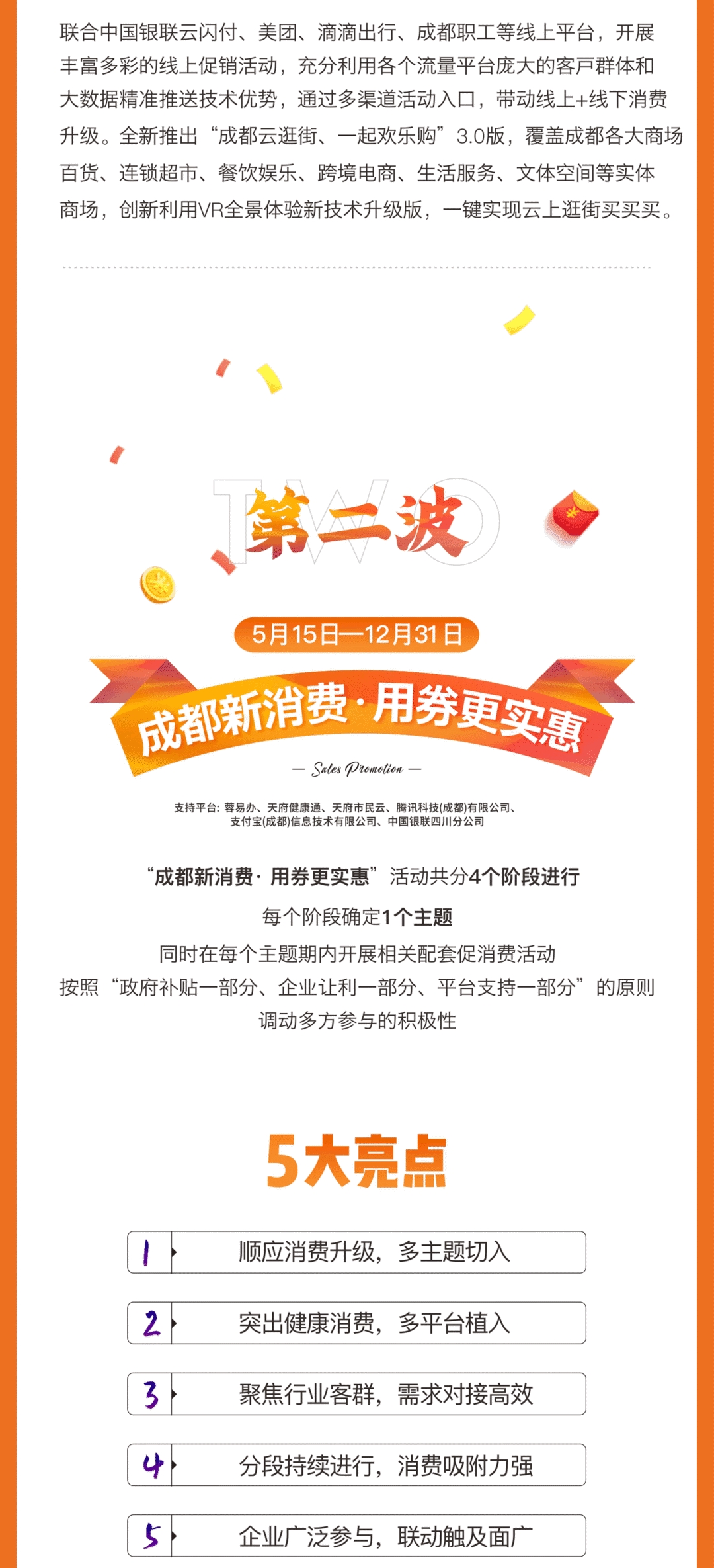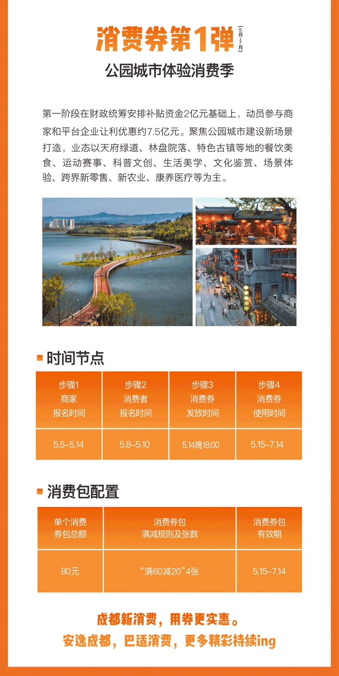 作为成都消费提振系列活动“重头戏”,成都将于5月5日开始,全面启动“成都新消费•用券更实惠”活动。
