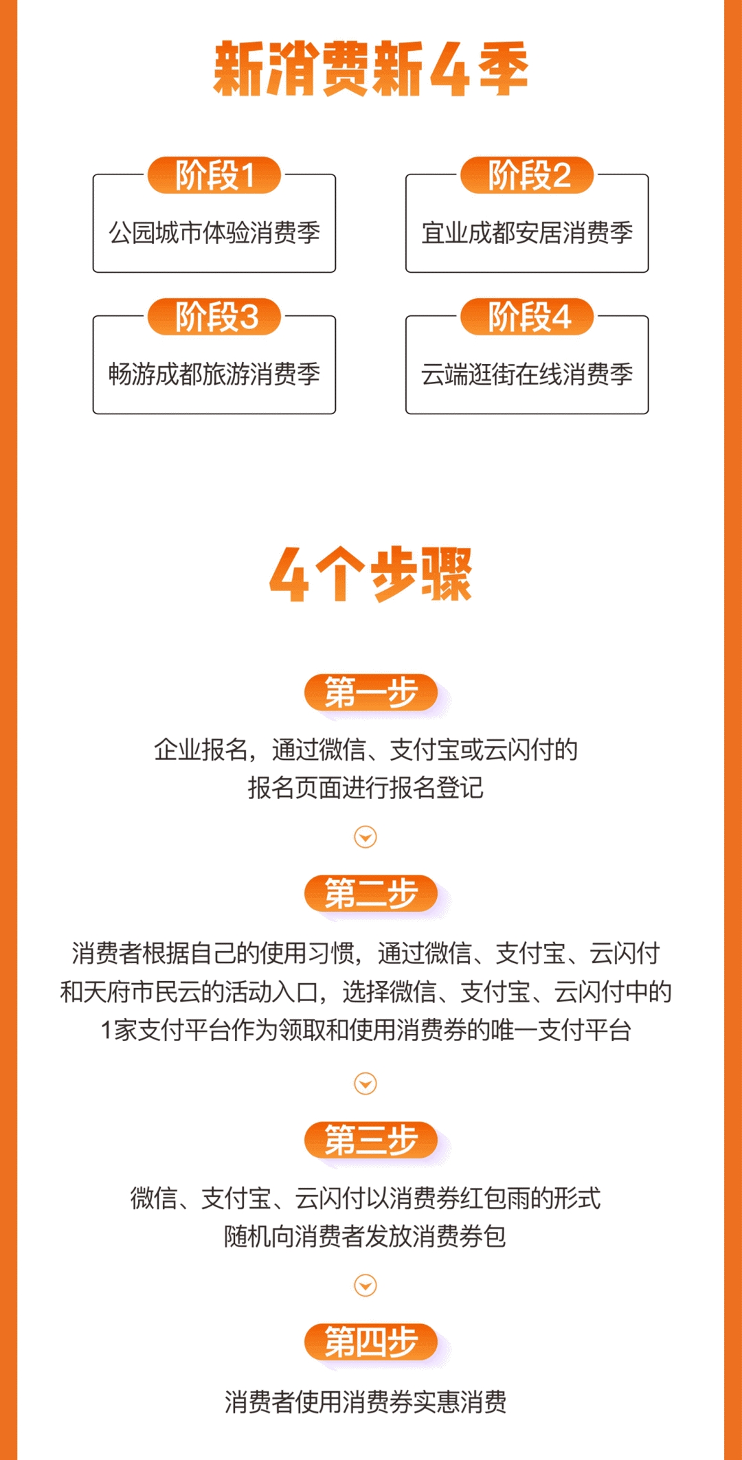 业内专家认为,发挥消费券提振经济的最大效用,需要在设计机制上下一番功夫,做到分阶段、结构化。不同于其他城市“派券”持续1-2个月,本次成都消费券“匠心独运”统一筹划至年末(12月31日),通过4大主题创新设计,每阶段策划一个主题,同时开展相关配套促消费活动。致力于最大限度放大政策和资金的杠杆作用、乘数效应,更显成都特质。