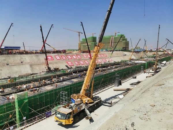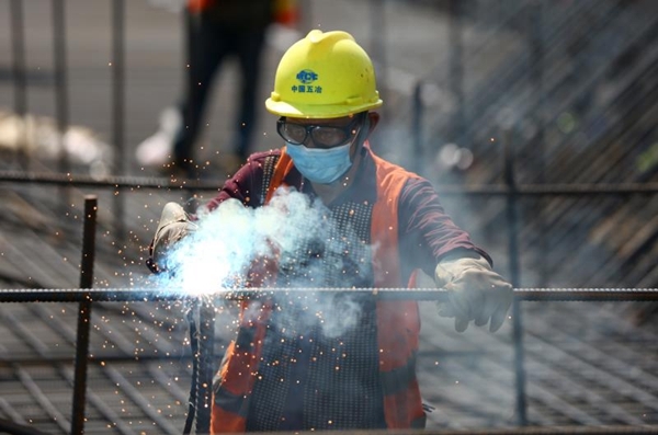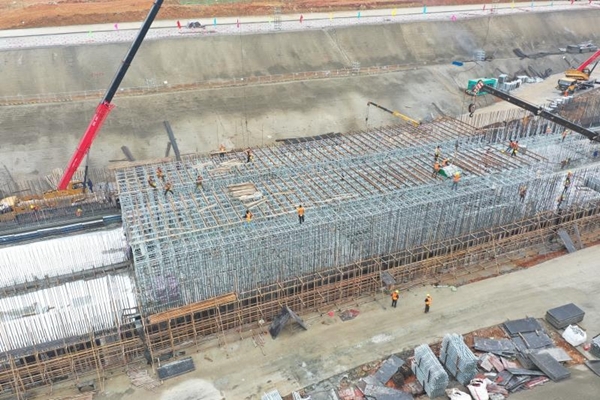 宣誓完毕后,他们一分钟也没耽搁,迅速回到了各自的工位,扎钢筋、支模、焊接、浇筑混凝土……展现出一片火热的建设景象。在他们的脚下,一条长达1.715千米的钢筋巨龙横亘南北,在不断闪烁的电焊弧光中渐渐成形。