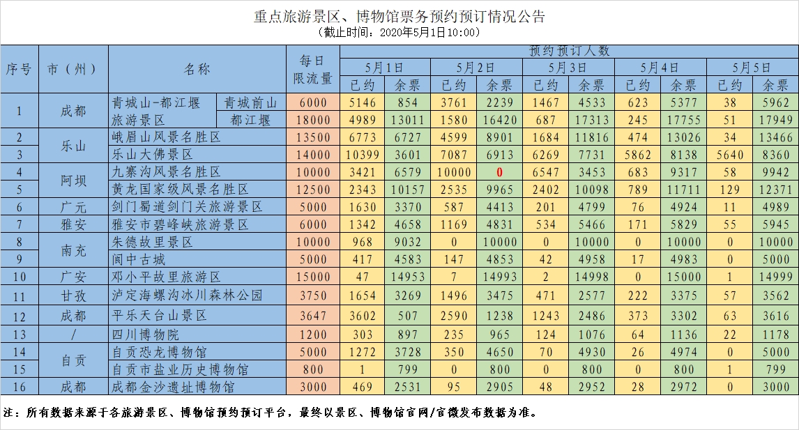 截至5月1日上午11点,当日和次日门票预约已满,5月3日余票剩3000多张。游客可在通过“阿坝旅游网”进行预约。