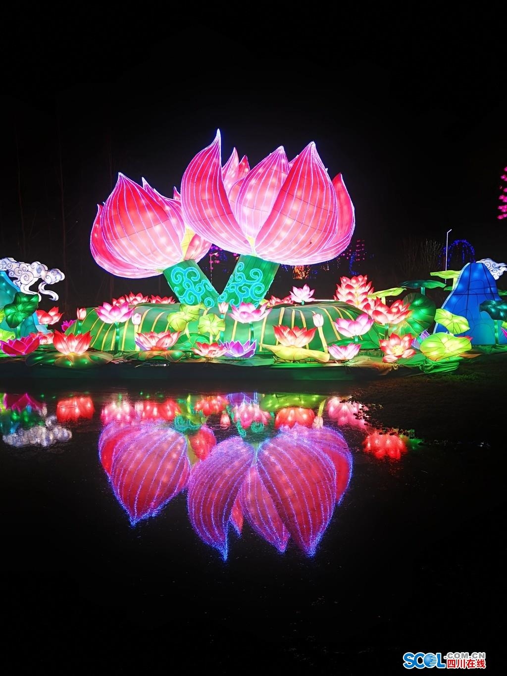 遂宁莲花灯会搭配了不少主题灯组,融入抗疫、本地民俗文化等内容。在布展方面,充分利用公园的内河湿地景观,彩灯与水面倒影交相辉映,创造出人在画中游的氛围,为游客带来不一样的观灯体验,“为活跃旅游市场,每天投放出300张优惠票。同时还与本地景区圣莲花海互动,双方游客可凭门票到另一方园区半价购票。”灯会负责人谢歆说。