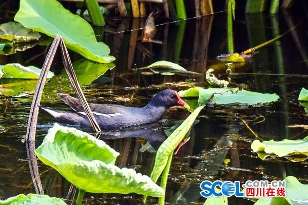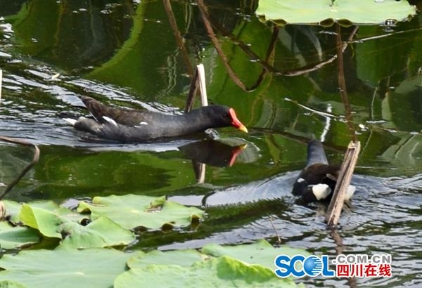 四川在线消息(记者 郝飞 摄影报道)5月3日,成都天府新区兴隆湖生态湿地公园的池塘里,有市民发现两只黑色羽毛、黄红尖嘴的水鸟,长相十分像鸡,不过它们却在水中畅游着觅食嬉戏,两只鸟叫起来完全是鸡的叫声,这奇怪的生物引起市民围观。