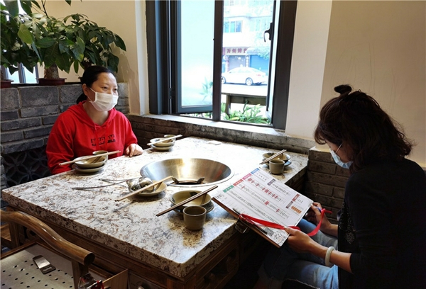 记者在该火锅店进门处看到,门上贴有倡议书,上面详细地要求餐馆做到“六要”(要勤消毒、戴口罩、测体温、强通风、限流量、缩时间)及顾客做到“三不”(不聚集、不恋酒、不食野味)的相关内容,而餐厅工作人员正在给前来就餐的顾客测量体温,安排顾客分散就坐。