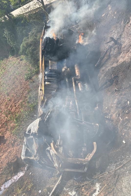 14时50分左右,消防救援人员到达现场。此时,侧翻到坎下的混凝土泵车“四脚朝天”,整个车身被熊熊的大火包围。而停在路面的罐车车头严重受损,且油箱破裂,大量的柴油正在向外滴漏。事故现场,情况危急。