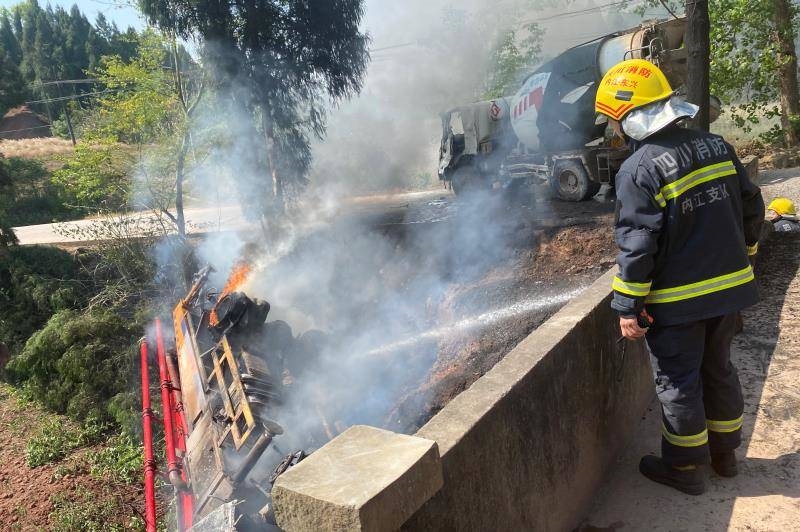 四川在线消息(谢正旗 记者 陈松)5月2日14时许,在内江市东兴区高梁镇鱼家嘴村附近,一辆混凝土泵车与一辆混凝土罐车相撞,导致泵车侧翻坎下熊熊燃烧。接到报警后,内江市消防救援支队兴盛路消防救援站立即出动2车14人火速前往现场处置,所幸此次事故没有造成人员伤亡。
