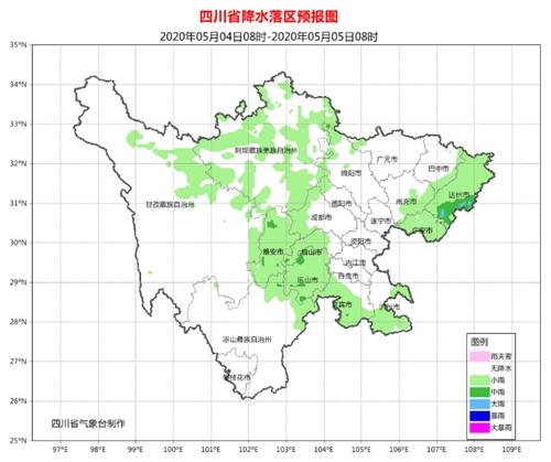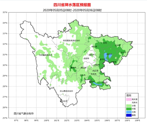 中央气象台预计5月5日20时至6日20时,四川盆地中东部的部分地区有中雨。