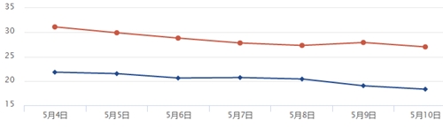 据四川省气象台预报,降温今天(5月4日)就开始。不过,预计今天的全省平均最高气温仍然会站在30℃以上。从今天开始,全省平均气温的走势是酱紫,各地日均最高气温将渐渐回到2字头~