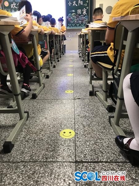 成都市东城根街小学C区目前有一年级11个班。6日早上,学生从7点50开始陆续进入校园,地上每间隔一米张贴了一张“笑脸”,用以提醒学生保持距离。学生进入校园后,通过“热成像测温通道”,体温无异常者可以进入教室。