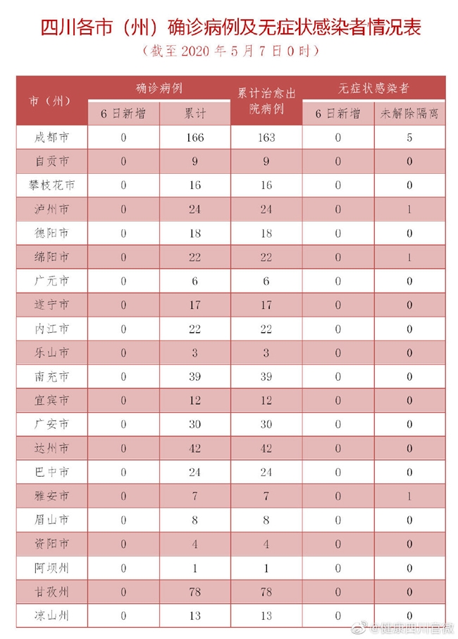 四川在线消息(记者 石小宏 殷鹏)5月7日,记者从四川省卫健委获悉,5月6日0-24时,四川无新增新型冠状病毒肺炎确诊病例,无新增疑似病例,204人尚在接受医学观察。