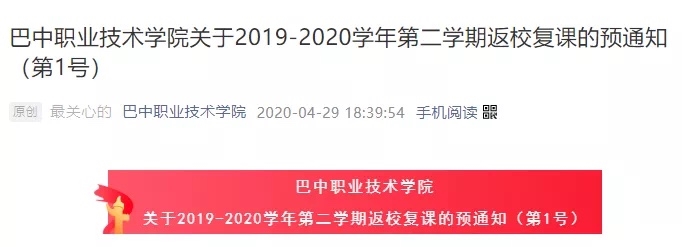 巴中职业技术学院拟于五月中旬开始返校复课,在返校时间没有确定前,全体师生继续做好线上教学工作,严禁任何学生提前到校。