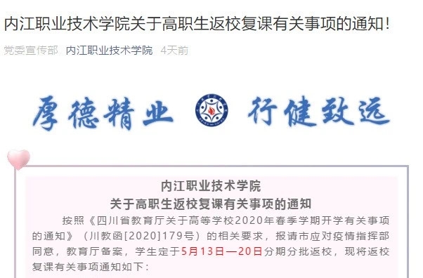 内江职业技术学院将于5月13日 — 20日分批安排学生返校。