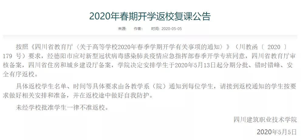 四川建筑职业学院将于2020年5月13日起安排学生分期分批、错时错峰、安全有序返校。