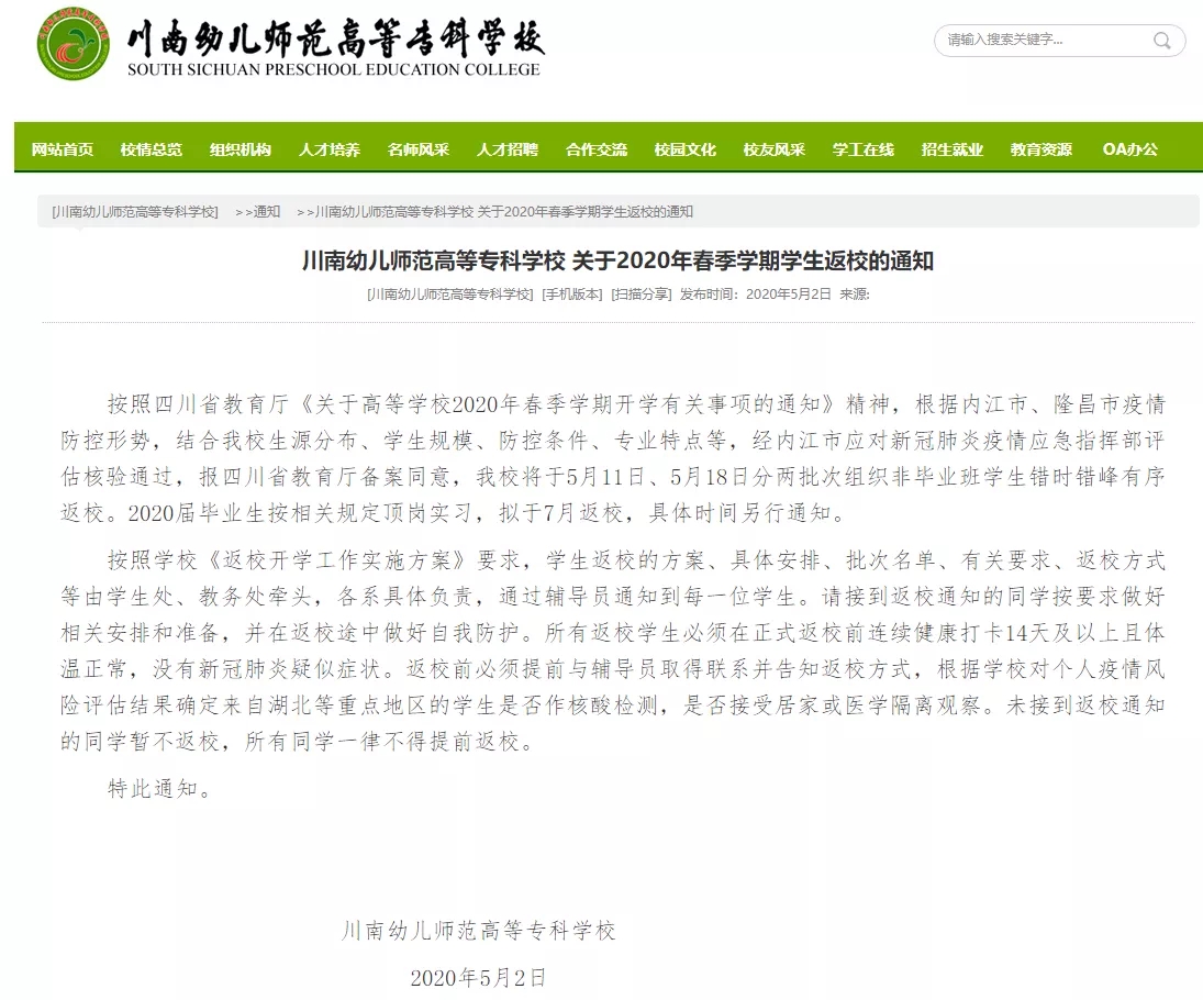 川南幼儿师范高等专科学校将于5月11日、5月18日分两批次组织非毕业班学生错时错峰有序返校。