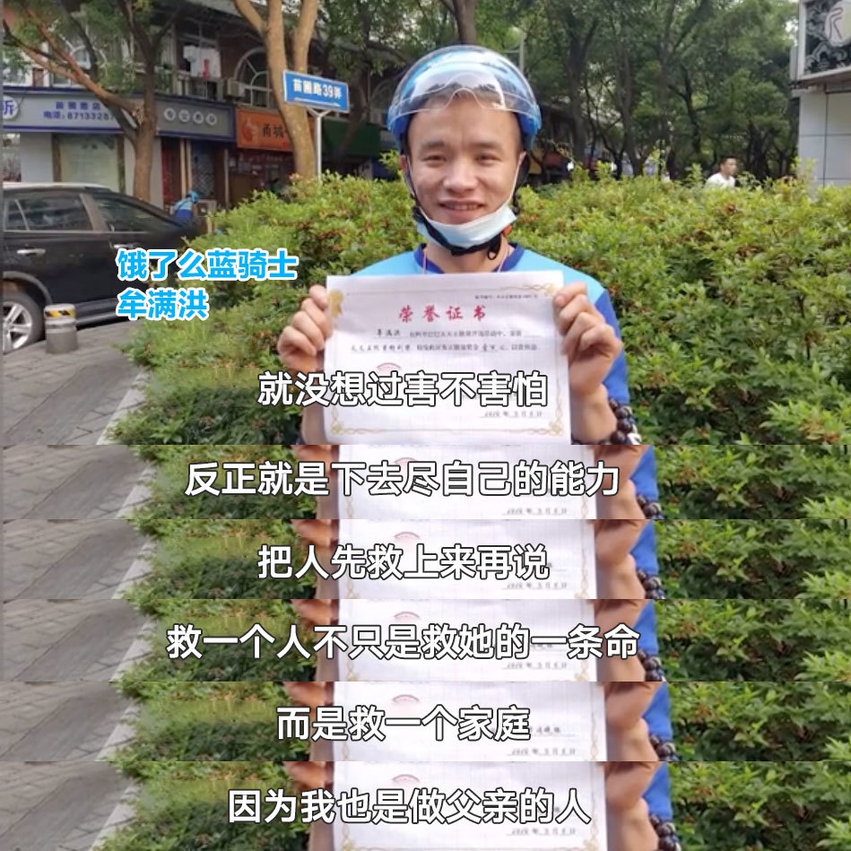 经过询问,大家才知道小伙子叫牟满洪,是名饿了么的外卖蓝骑士,刚好工作途中路过江北大桥,看到很多人在搜救,他眼尖,最先发现了在江水中漂浮的落水者。
