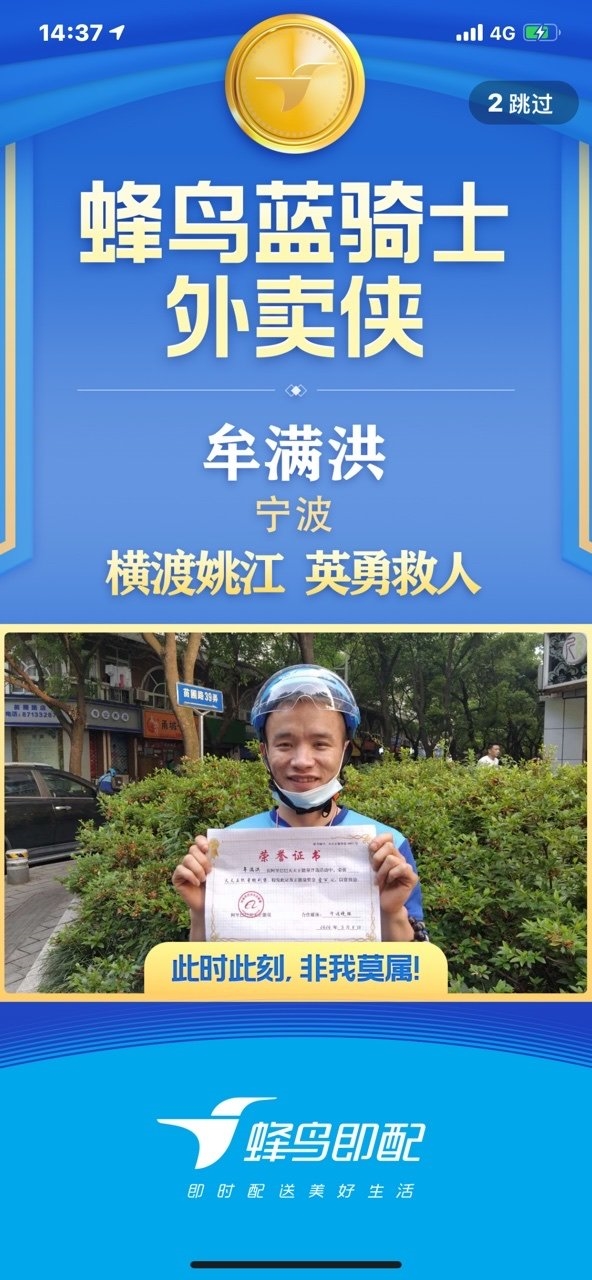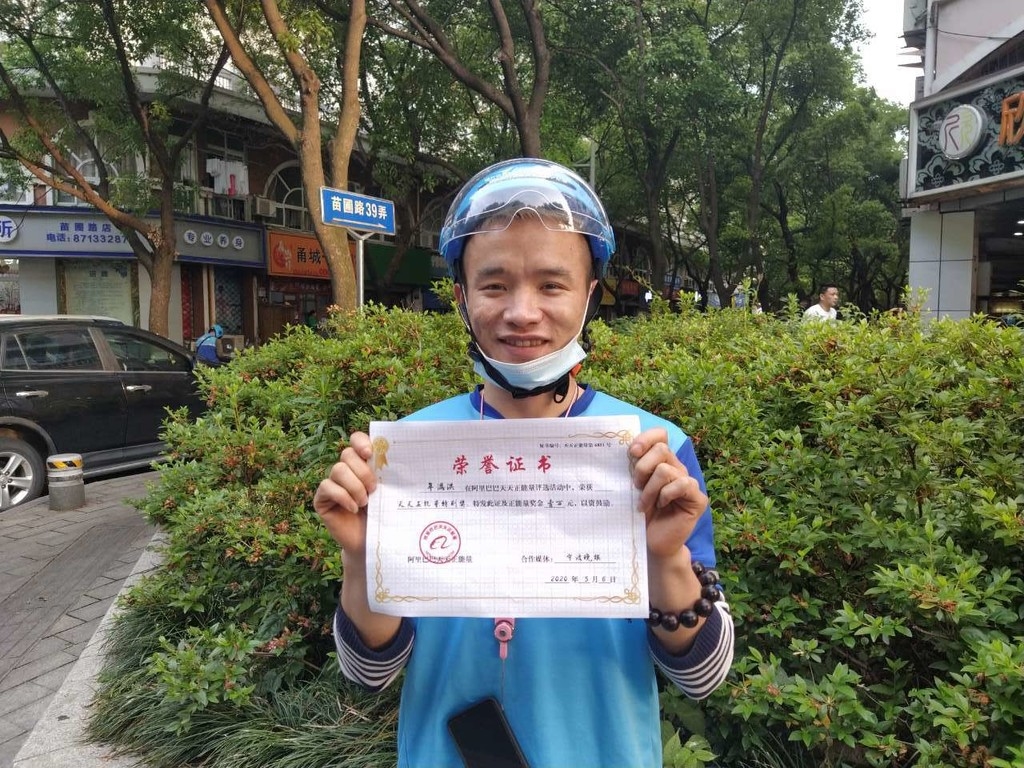 为了表彰蓝骑士小牟的见义勇为行为,不仅阿里巴巴天天正能量联合宁波日报为他颁发奖状,并发放奖励一万元。另外,平台也授予他“外卖侠”荣誉称号,奖励现金3000元。