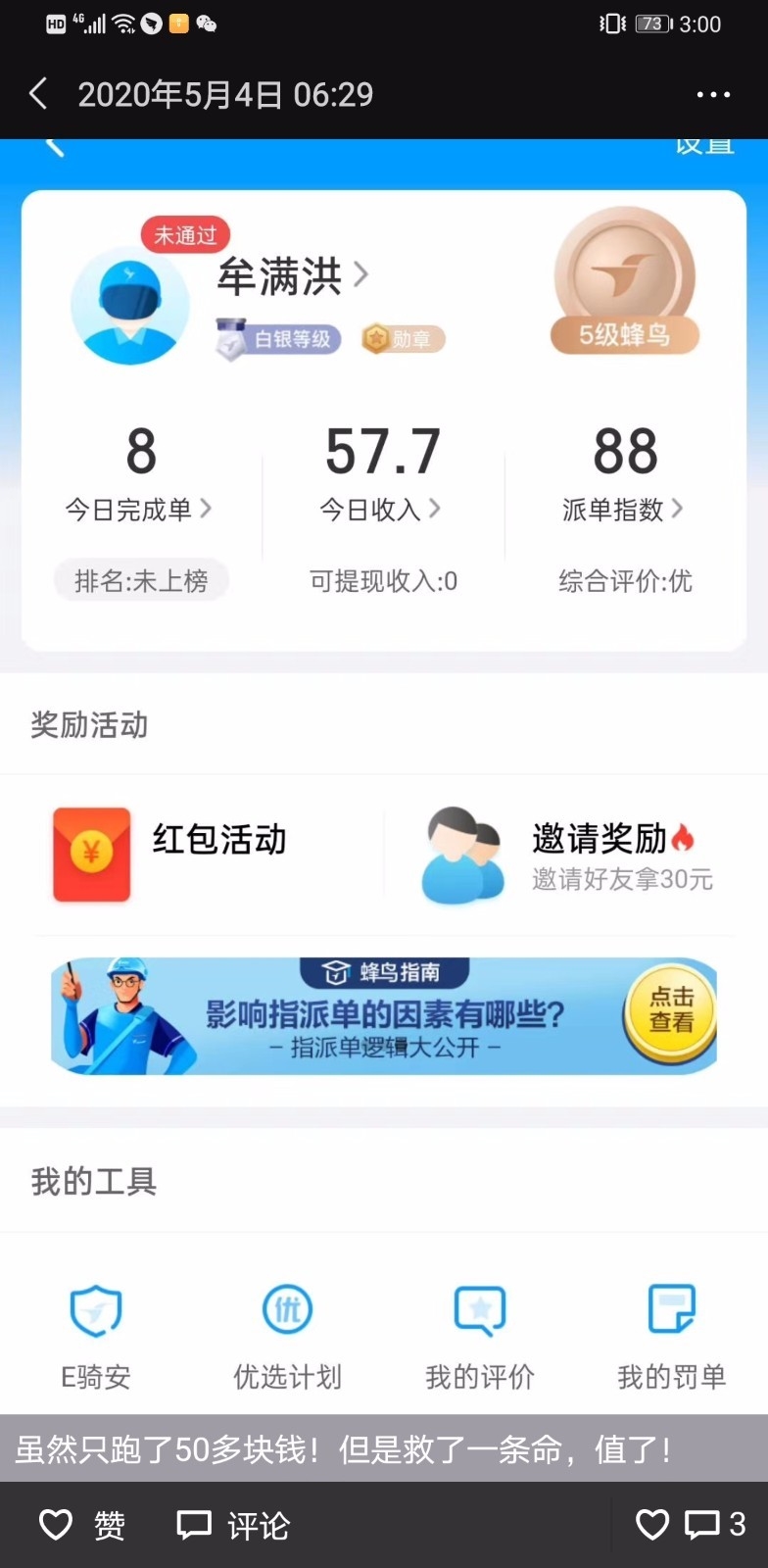 牟满洪今年2月份开始加入宁波饿了么蓝骑士,兼职送外卖,算起来刚3个月。