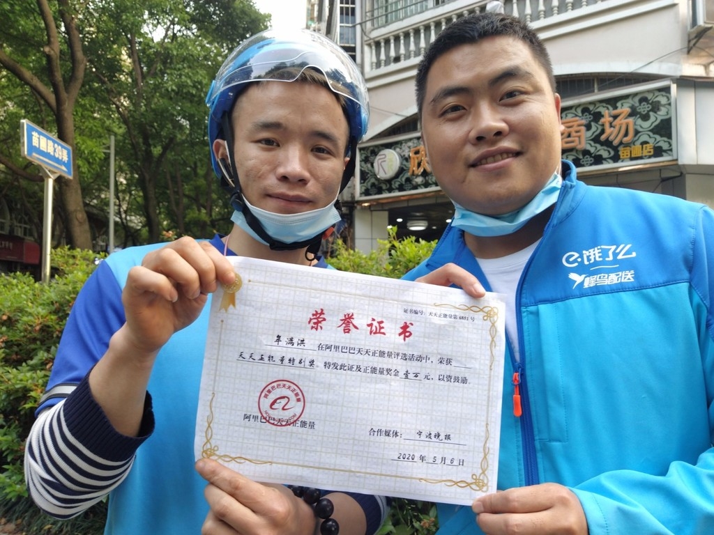 (饿了么蓝骑士牟满洪(左一)获得天天正能量的荣誉证书和奖励)