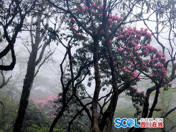 5月9日,在乐山市峨眉山景区雷洞坪区域,漫山的高山杜鹃醒来了第二波盛花期。当粉白相间的杜鹃遇上雨水带来的山雾,峨眉瞬间化身“仙境”。