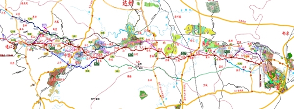 巴中境段选址选线:起于通江县广纳镇境内,对接本项目陕川界至通江段,路线经佛驹山村、枸花坪村,在东山乡枸花坪附近设置东山互通。后路线经广纳镇,跨通江河至三溪乡,在纳溪口设置桥梁跨越洗脚溪至平昌灵山乡境内。在草坝村设置灵山互通连接灵山镇、巴灵台景区和通江铁佛镇,在洗滩坝附近跨越通江河至云台镇洪保观,在夏家梁附近设置云台互通。后路线经荔枝、泻巴至平昌县城以东设置江口枢纽互通与巴达高速公路相交;路线经江口、星光工业园区,在俞家溪附近跨越巴河至金宝,并在金宝附近设置平昌互通;后路线在金宝徐家湾附近下穿巴达铁路,并设置隧道翻越尖山至岳家,在江陵庵附近设置互通;后路线经白衣、得胜至西兴曙光村进入达州市境内。巴中境内长61.681公里,其中通江县境内长13.208公里,平昌县境内长48.473公里。