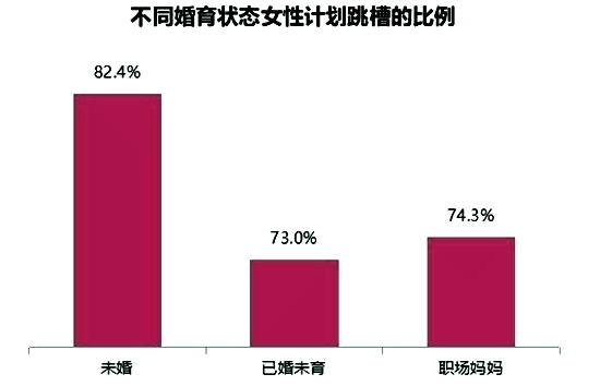 数据显示,婚育状况对于职场女性的跳槽计划也有所牵制。未婚女性对待跳槽相对洒脱,82.4%表示准备跳槽,分别高出已婚未育女性与已婚已育女性9.4、8.1个百分点。职场妈妈群体在跳槽时不如未婚女性洒脱,但却好于已婚未育女性,或与已婚未育女性在求职中面对更多偏见有关,她们在跳槽时也顾虑更多。
