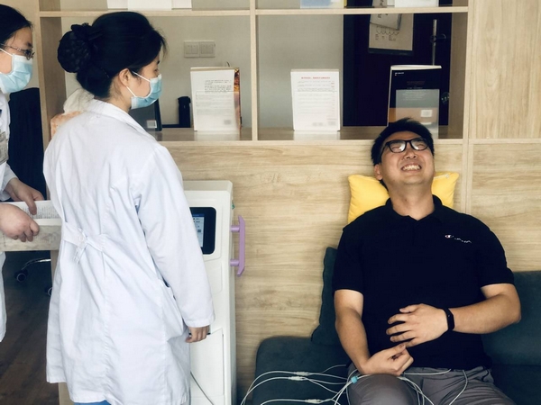 随后,男性职工坐上分娩阵痛体验仪器,通过电流刺激腹部来模仿分娩阵痛,让体验者感受到“分娩”的痛感。