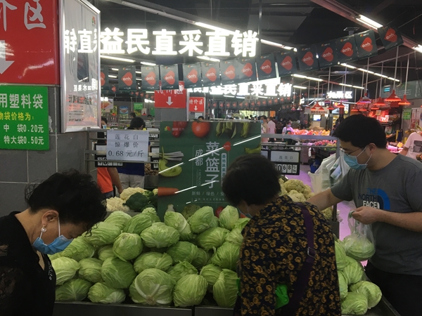 益民生鲜四季农产品公司副部长易前梅介绍,目前益民菜市24家门店设立了“成都市‘菜篮子’基地蔬菜直销点”,日供应量达3.5吨。“通过基地直采的形式,省去了中间流通环节,降低了成本,市民也能买到便宜菜。据悉,首批基地莲花白价格平均每斤0.68元,低于周边价格50%。