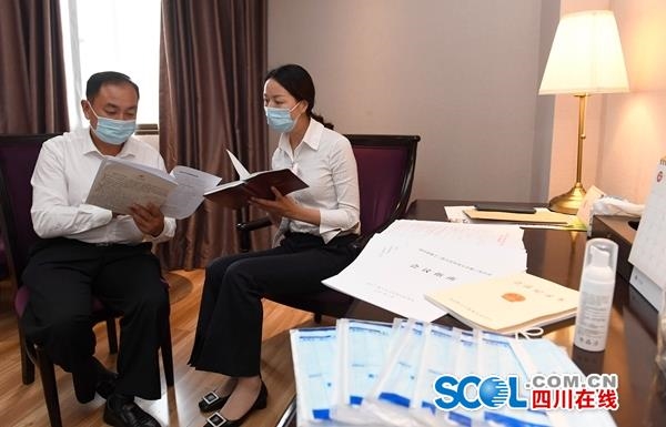 5月8日,周娟代表(右)邀请住驻地隔壁房间的张辉代表一起讨论议案内容。