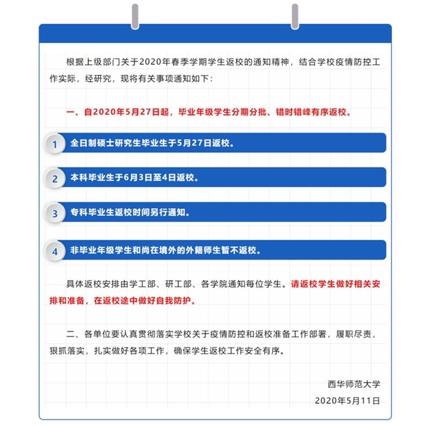今日(5月11日)上午,当记者在发四川部分高校开学时间的时候,不少西华师大的同学们在留言问,自己的学校什么时候开学?刚刚,记者从西华师大获悉,5月27日起西华师大获返校复学。根据通知,5月27日起,西华师大毕业年级学生分期分批、错时错峰有序返校;非毕业年级学生和尚在境外的外籍师生暂不返校。
