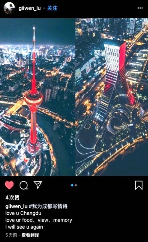 一位叫Qihong的澳大利亚网友写道:“宽巷儿慢慢盖碗茶,映城外,泛泛竹林滚滚来”;悉尼科技大学的学生Reki He写道:“成都既有人间烟火的气息,也有时尚摩登的样子,令你爱上这个包容的城市”……在世界各地的青年们用最中国的语言、最浪漫的情怀,表达着对成都的喜爱。
