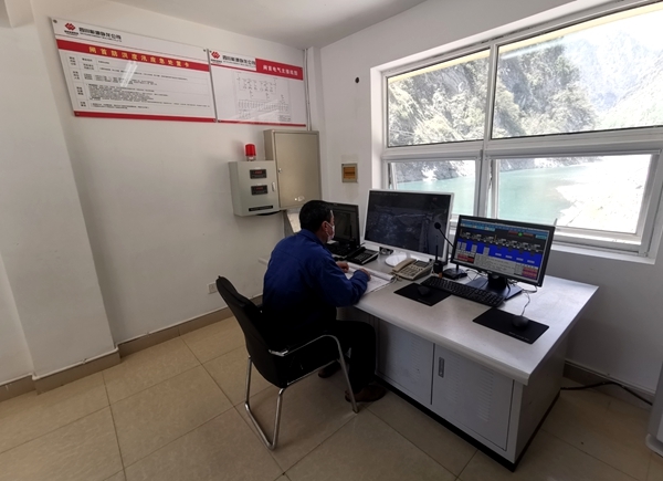 汶川县耿达镇的龙潭电站值班室里,工作工人在监测上游来水 邵明亮 摄