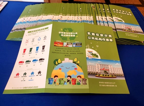 “这个垃圾分类宣传材料做得很好,我要带回去 ,挂在我们‘幸福庙岗’公众号上。”5月11日,省人大代表、荥经县新添镇庙岗村党支部书记詹良兵在驻地,领取了一份专门向代表委员提供的垃圾分类知识宣传手册。