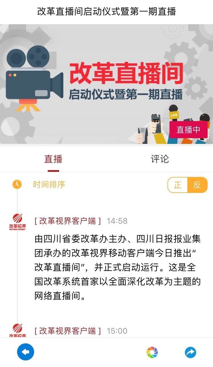 “改革直播间”以省委改革办和四川日报报业集团联合打造的“改革视界”移动客户端为依托,坚持“创改革特色品牌、求先发宣传效应”功能定位,重点聚焦四川省各领域、各地改革新动态、新举措和新经验,第一时间权威报道解读四川改革举措,为四川改革营造良好舆论氛围。