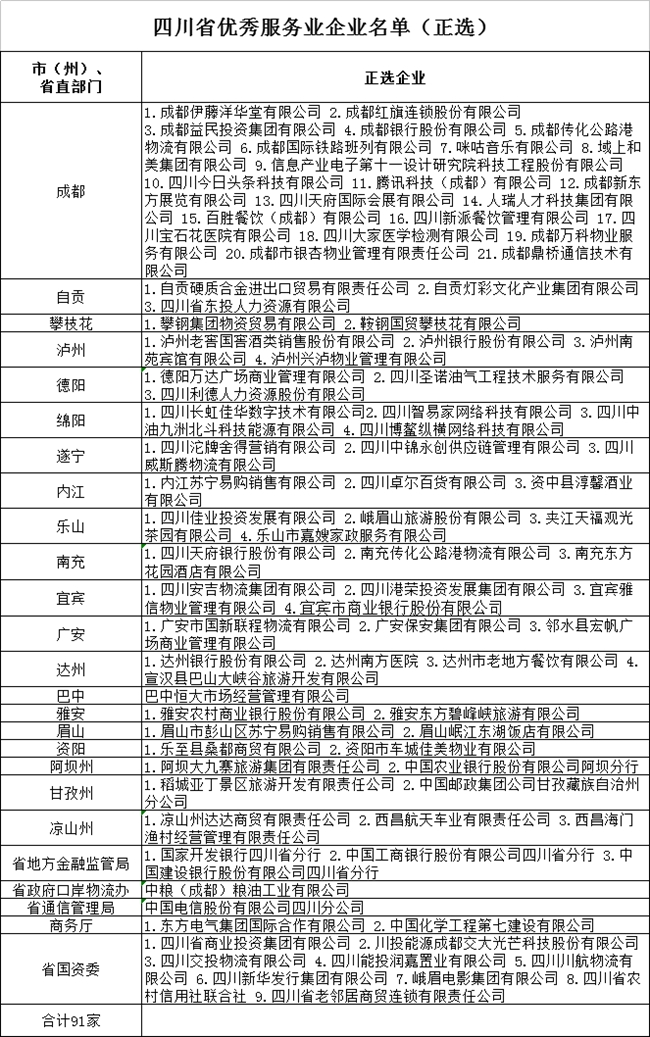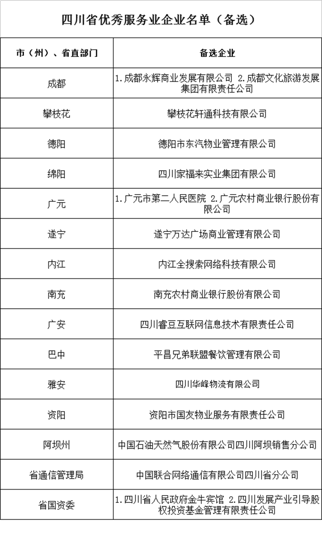 近日,根据《中共四川省委办公厅 四川省人民政府办公厅关于推荐评选四川省优秀服务业企业通知》文件精神,经各市(州)党委、政府和省直有关部门推荐,并征求相关部门意见,四川省商务厅将拟表彰企业名单(含正选、备选)予以公示,广泛听取社会各界意见,接受广大群众监督。