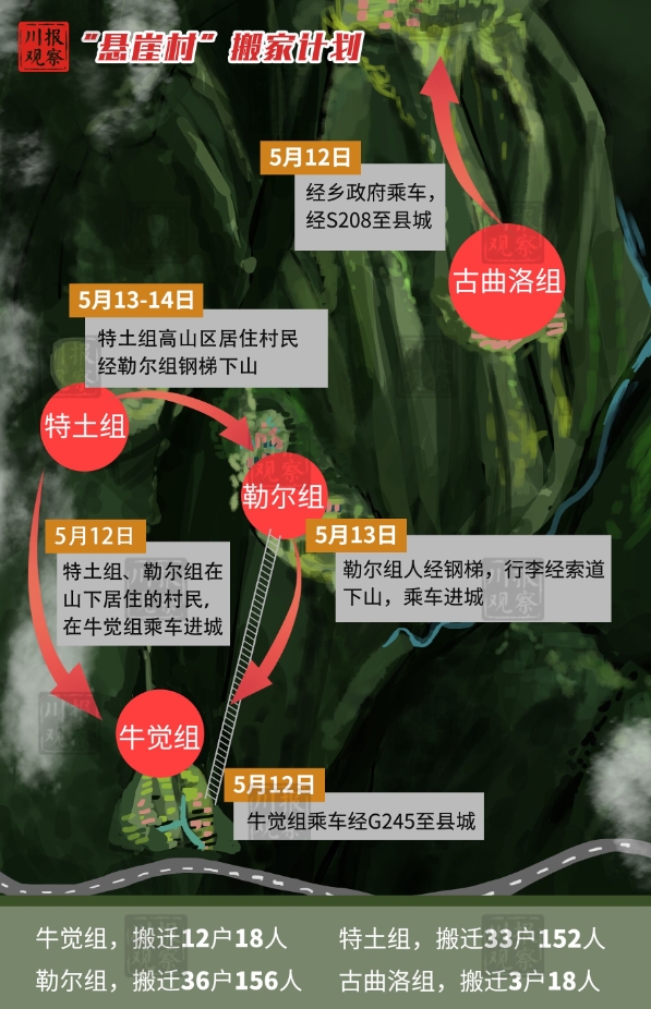 5月12日,“悬崖村”26户居住在山脚下的贫困户已搬迁到易地扶贫搬迁县城集中安置点。13日,居住于高山区、需攀爬钢梯上下的特土组和勒尔组31户贫困老乡,将采取“人走钢梯、行李走索道”方式下山,在山脚下牛觉组集中乘车,进县城、领钥匙、搬新家。14日,还有27户搬迁。届时,全村84户贫困老乡将全部搬至县城安置点居住。
