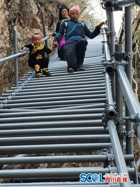 村民们沿着钢梯下山。