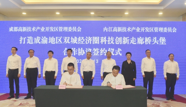 签约仪式上,四川天府新区成都管理委员会与内江市人民政府签署《合作共建四川区域协同发展总部基地 加快两地联动发展战略合作协议》、成都高新技术产业开发区管理委员会与内江高新技术产业开发区管理委员会签署《打造成渝地区双城经济圈科技创新走廊桥头堡合作协议》。