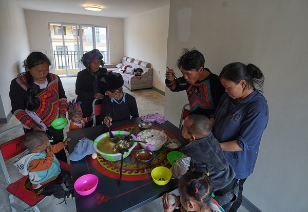 5月13日,昭觉县易地扶贫搬迁县城集中安置点迎来“悬崖村”的第二批次搬迁村民。下午17点20分,在县城集中安置点3号点拉博家100平方米新房中,乔迁新居后的第一顿开伙饭温暖开启。