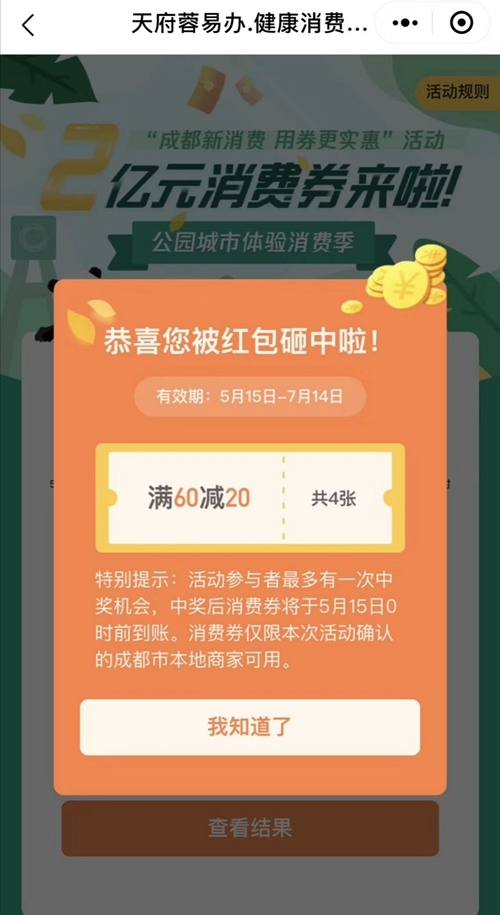 据了解,每位中券的微信用户将得到总额80元的消费券包,共含4张“满60减20元”的满减消费券。5月15日至7月14日期间,消费者在成都市线下实体商家使用微信支付结算时将自动抵扣。
