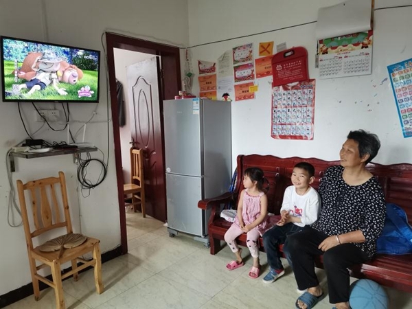 泸县喻寺镇周堰村3组的陈家碧老人陪孙子看电视 曾佐然 摄