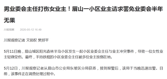 四川在线消息(记者 文铭权 樊邦平)5月12日,四川在线以《男业委会主任打伤女业主!眉山一小区业主请求罢免业委会半年无果》为题,报道了位于眉山城区的阳光森林半岛小区业主与业主委员会长达半年的“罢免”风波。报道得到眉山社会各界和相关主管单位的广泛关注。