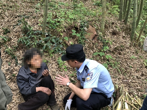 雅安市天全县一名七旬老婆婆在深山里迷失了方向,一天一夜不见踪影,所幸,当地警方及时启用警犬,在山林中寻找到了已瘫倒在地的老人,将她背出了深山。