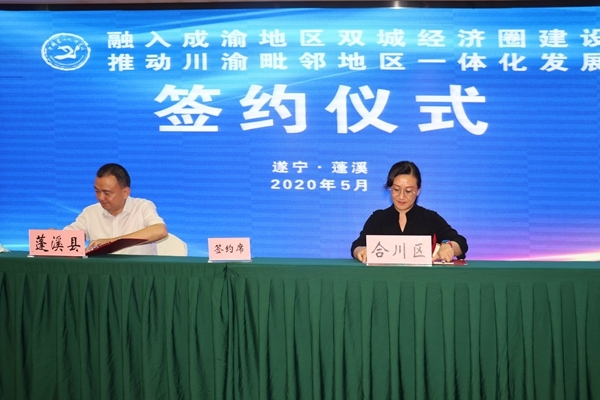 5月15日,融入成渝地区双城经济圈建设推动川渝毗邻地区一体化发展蓬溪会议在遂宁市蓬溪县举行。会上,蓬溪县分别与重庆潼南区和合川区、南充嘉陵区和西充县、广安武胜县签署关于推动川渝毗邻地区一体化发展先行示范区建设的合作协议。