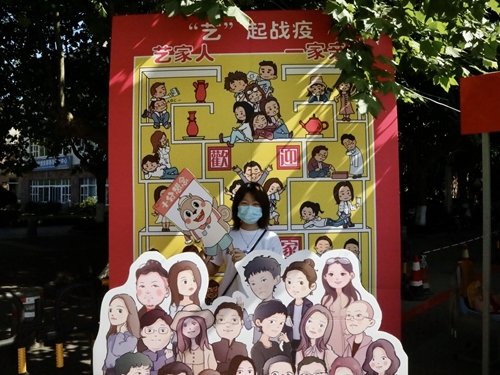 进入校园后,记者看到宽阔的操场上,临时搭建起一顶顶红色的帐篷,这里是各学院的开学报道处。在艺术与传媒学院的报道处,有一面卡通人物墙,上面是Q版的老师和同学形象,还写着“艺家人、一家亲”、“欢迎回家”等温馨的话语,吸引不少学生打卡拍照。